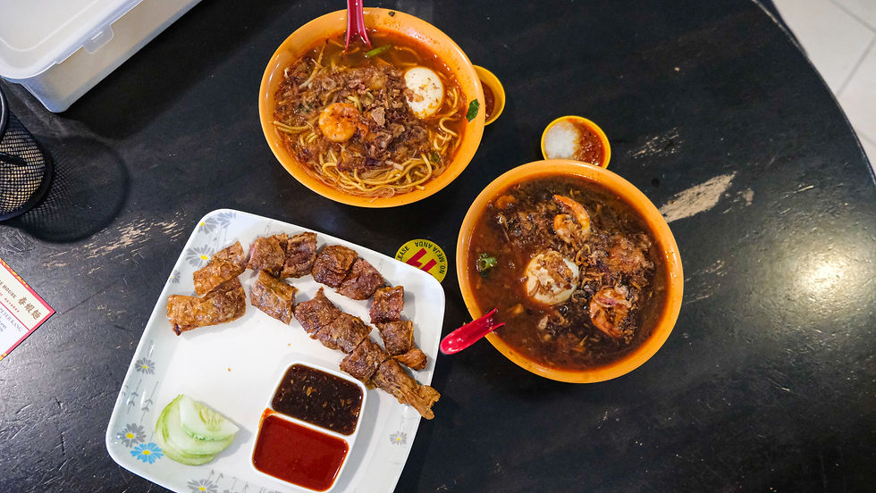 Prawn Mee is one of Penang's greatest kopitiam staples, if not THE greatest. Originating from Fujian, China it is also known within Penang as Hokkien (the name 'Fujian' in its dialect) Mee - not to be confused with the KL Hokkien Mee which is a completely different noodle dish stir fried in dark soy sauce, nor with the Singaporean Hokkien Mee which is less-soupy noodles with similar toppings in a much paler stock. According to Googled sources, Penang's prawn mee most closely resembles the Xiamen prawn noodle.